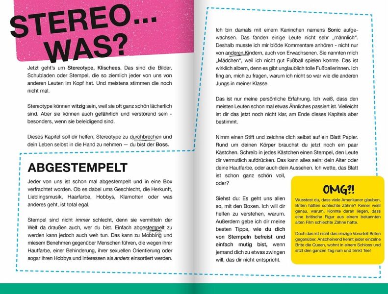 Das Sachbuch "Raus aus der Box!" richtet sich an junge Leser_innen, die auf der Suche nach persönlicher Stärke und Selbstvertrauen sind. Der Autor, Liam Hackett, Gründer der Anti-Mobbing-Organisation "Ditch the Label", verwendet persönliche Erzählungen, Interviews mit Experten und die Geschichten Jugendlicher, um zu zeigen, wie man Stereotypen überwinden und authentisch leben kann. Das Buch bietet konkrete Aufgaben und Reflexionsanregungen, die darauf abzielen, die Leser_innen von Ängsten zu befreien und sie dazu zu ermutigen, ihr wahres Ich anzunehmen. Das Buch ist nicht nur eine praktische Anleitung zur Selbstverbesserung, sondern auch ein inspirierender Ratgeber, der die Leser dazu anleitet, Vorurteile zu erkennen und abzubauen.