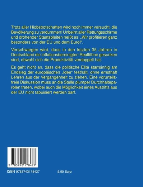Noch immer gilt die EU als heilige Kuh. Niemand wagt an ihrer Existenzberechtigung zu rütteln. Auch Kritik wird nur in verhaltener Form geäußert, wobei aber reflexartig auf die übergeordnete Bedeutung der Gemeinschaft verwiesen wird. Eine aufrichtige Analyse über Wert und Nutzen der EU wird tunlichst vermieden. Auch über die Ziele (Bundesstaat oder Staatenbund) wird sich ausgeschwiegen. Die Angst vor der Wahrheit verhindert jegliche neutrale Auseinandersetzung.Mit dem Buch "Raus aus der EU" versucht der Autor, eine mehr als überfällige Diskussion anzustoßen. Ohne Tabus, ohne Rücksicht auf "political correctness" und im harten Kontrast zur manipulierten öffentlichen Meinung. 65 Jahre nach Gründung der EWG muss es erlaubt sein, die inneren Widersprüche, Fehlentwicklungen und Ungereimtheiten auf den Tisch zu legen. Es kann nicht sein, dass alle begründeten Einwände und Zweifel von Politik und Medien mit albernen Standardfloskeln von der "wohlstandsfördernden und friedensstiftenden" EU abgeblockt werden. Schluss auch mit den zynischen Verhöhnungen ("Deutschland profitiert ganz besonders von der EU")!Es genügt nicht, aus aktuellem Anlass nur über den Euro oder die Flüchtlingskrise zu reden. Die Probleme der EU sind viel tiefgreifender und vielschichtiger. Nach Meinung des Autors zieht die EU, ob mit oder ohne Euro, unseren Kontinent in den Abgrund - falls es nicht bald zu einem Kurswechsel oder gar zur Auflösung kommt.