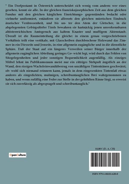 " Ein Dorfpostamt in Österreich unterscheidet sich wenig vom andern: wer eines gesehen, kennt sie alle. In der gleichen franziskojosephischen Zeit aus dem gleichen Fundus mit den gleichen kärglichen Einrichtungs- gegenständen bedacht oder vielmehr uniformiert, entäußern sie allerorts den gleichen mürrischen Eindruck ärarischer Verdrossenheit, und bis un- ter den Atem der Gletscher, in die abgelegensten Gebirgsdörfer Tirols bewahren sie hartnäckig jenen unverkennbaren altösterreichischen Amtsgeruch aus kaltem Knaster und muffigem Aktenstaub. Überall ist die Raumeinteilung die gleiche: in einem genau vorgeschriebenen Verhältnis teilt eine vertikale, mit Glasscheiben durchbrochene Holzwand das Zim- mer in ein Diesseits und Jenseits, in eine allgemein zugängliche und in die dienstliche Sphäre. Daß der Staat auf ein längeres Verweilen seiner Bürger innerhalb der allgemein zugänglichen Abteilung geringes Ge- wicht legt, wird durch das Fehlen von Sitzgelegenheiten und jeder sonstigen Bequemlichkeit augenfällig. Als einziges Möbel lehnt im Publikumsraum meist nur ein zittriges Stehpult ängstlich an der Wand, den rissigen Wachsleinwandüberzug von unzähligen Tintentränen geschwärzt, ob- wohl sich niemand erinnern kann, jemals in dem eingesenkten Tintenfaß etwas anderes als eingedickten, mulmigen, schreibuntauglichen Brei wahrgenommen zu haben, und wenn zufällig eine Feder zur Stelle in der gehöhlten Rinne liegt, so erweist sie sich zuverlässig als abgespragelt und schreibuntauglich."