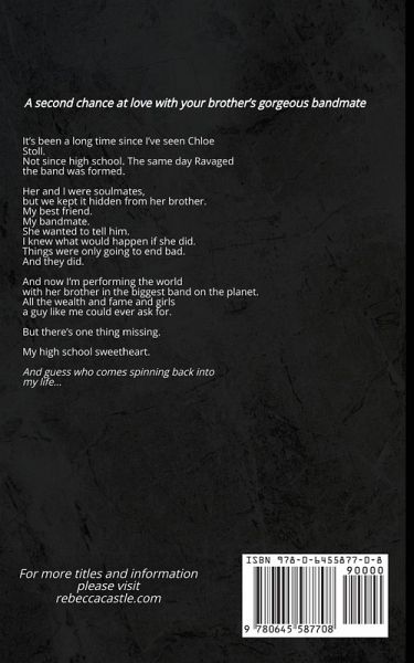 A second chance at love with your brother's gorgeous bandmate. It's been a long time since I've seen Chloe Stoll. Not since high school. The same day Ravaged the band was formed. Her and I were soulmates, but we kept it hidden from her brother. My best friend. My bandmate. She wanted to tell him. I knew what would happen if she did. Things were only going to end bad. And they did. And now I'm performing the world with her brother. In the biggest band on the planet. All the wealth and fame and girls a guy like me could ever ask for. But there's one thing missing. My high school sweetheart. And guess who comes spinning back into my life... I remember all those times Those times I made you laugh and cry We stayed up late, we kissed and we loved Why can't we go back there, baby? Why can't I see that smile? Book #2 of the Ravaged Rockstar series. Even though this book can be read as a standalone, it is best to start the series with book #1 (Ravaged For You). Recommended for mature audiences.