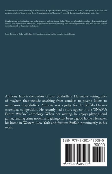 Near the town of Barker, something stalks the woods. A legendary creature striking fear into the hearts of townspeople. It has been seen peering in windows. Trying to open doors. Attacking motorists. The creature's howls fill the night. And sightings are on the rise. Gina Peretti and her husband are on a weekend getaway with friends near Barker. Things get off to a bad start when a deer runs in front of their car, sending the vehicle into a ditch. They soon learn the deer was running from something monstrous. And their weekend vacation turns nightmarish as the creature stalks them. Soon, the town of Barker will feel the full fury of the creature, and the battle for survival begins.