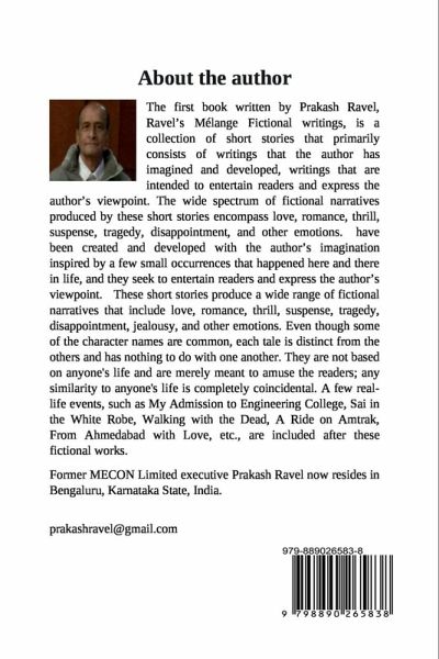 Ravel's Mélange Fictional Writings, is a collection of short stories that primarily consists of writings that the author has imagined and developed, writings that are intended to entertain readers and express the author's viewpoint. The wide spectrum of fictional narratives produced by these short stories encompass love, romance, thrill, suspense, tragedy, disappointment, and other emotions. Each tale is distinct from the others.