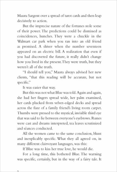 Every year, Blue Sargent stands next to her clairvoyant mother as the soon-to-be dead walk past. Blue herself never sees them - not until this year, when a boy emerges from the dark and speaks directly to her.