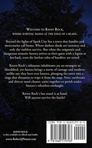 Welcome to Raven Rock, where survival hangs at the edge of a blade. Beyond the lights of Spark City lies a town that bandits and mercenaries call home. Where darkest deeds are currency, and only the ruthless survive. But when the enigmatic and dangerous assassin Aurora arrives at their gates with a legion at her back, even the lawless rules of banditry are tested. Raven Rock's infamous inhabitants are no strangers to bloodshed, yet Aurora brings a storm of carnage and madness unlike any they have ever known, plunging the town into a siege that threatens to wipe it from the map. Now, cutthroats and thieves must choose: unite together or perish under Aurora's relentless onslaught. Raven Rock's last stand is at hand. Will anyone survive the battle? From the acclaimed author of The Spark City Cycle, Robert J Power, comes a gripping tale where the line between friend and foe blurs with each swing of the sword, leaving you questioning where true loyalties lie. Perfect for new readers, or long-time fans, this thrilling adventure can be enjoyed as a standalone tale, or as part of the larger Spark City Cycle.