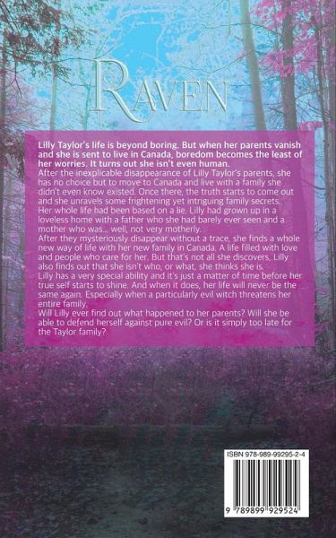 "I want to start by saying how epic this book was! I'm a teenager (I'm using my mum’s account) and I felt this is (almost, it's definitely in the top 3) the best book I've read" "Refreshingly different from the usual YA novels" "There are so many feelings you want to get back to. With books I want that Twilight feeling back, that Harry Potter feeling-and RAVEN gives it! I'm so happy I get to look forward to a series that I love again" "I was gripped from start to finish. This book is a must for any Twilight fans out there. Raven has everything you expect from a fantasy novel and more" "...the perfect book for the young (younger) adult reader who enjoys the supernatural. It's easy to read, no sex or horrible violence, so it's very suitable for even younger readers" Shapeshifters, witches, vampires, werewolves, werecats, ghosts…. these are just some of the creatures you’ll find hiding in plain sight in a small Canadian town in British Columbia. A town that is about to welcome a girl from England. A girl whose parents have mysteriously vanished. A girl whose life is about to change beyond all imagination… After the inexplicable disappearance of Lilly Taylor's parents, she has no choice but to move to Canada where she unravels some frightening yet intriguing family secrets... Her whole life had been based on a lie. Lilly had grown up in a loveless home with a father who she had barely ever seen and a mother who was... well, not very motherly. After they mysteriously disappear without a trace, Lilly is sent to Canada where she finds a whole new way of life. A life filled with love and people who care for her. But that's not all she discovers, Lilly also finds out that she isn't who, or what, she thinks she is. Lilly has a very special ability and it's just a matter of time before her true self starts to shine. And when it does, her life will never be the same again. A great book for lovers of Maggie Stiefvater, Stephenie Meyer & JK Rowling.