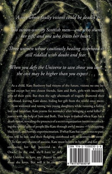 A seer whose faulty visions could mean death for those around her. Two swoon-worthy Scottish men-one who shares her gift, and one who trusts her heart. Three women whose cautiously healing sisterhood is still riddled with doubt and fear, as they struggle to understand and accept the power of their connection. The complicated threads that entwine their fates leave little question: when you defy the Universe to save those you love, the cost may be higher than you expect . . . As a child, Kate Banberry had visions of the future, visions almost no one believed except her two closest friends, Sam and Beth, girls with incredible gifts of their own. But then the ugly aftermath of tragedy shattered their sisterhood, leaving Kate alone, hiding her gift from the world once more. Now widowed and raising two young daughters while running a failing bed and breakfast, Kate yearns for normalcy after bringing a serial killer to justice with the help of Sam and Beth. This hope is dashed when Kate has a death vision, revealing the presence of a secret black ops military group intent on unlocking the special gifts of people like Kate through awful means - kidnapping, blackmail, and horrific experimentation. If what Kate has seen comes to pass, lives will be lost, and their fledgling sisterhood will be destroyed. Forever. Even with Sam's connections with the Wardens of Entwine and Beth's willingness to bring the facility to its knees, Kate knows they'll need her visions to succeed. Visions which are unreliable at best. Along with her old friends, she rallies ones, including two men who remind her of what she's been missing in her life - romantic love. To have any chance of success, Kate must believe in herself and her gifts, embracing her full potential as the Oracle. In the end, she'll have to defy the Universe to have any chance to save those she loves. But will it be enough?