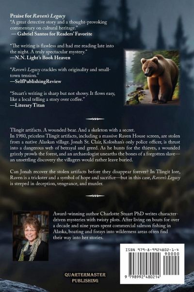 Tlingit artifacts. A wounded bear. And a skeleton with a secret. Irreplaceable Tlingit artifacts, including a 15'x 8' spruce Raven House screen, are stolen from a native village in Alaska in 1980. Their only police officer, Jonah St. Clair, investigates the theft and the disappearance of a local man who may have been involved. At the same time there's a wounded grizzly on the loose and an archeologist unearths the bones of a slave, a relic the villagers prefer to leave buried. When one of the thieves absconds with most of the artifacts as well as the $500,000 paid for them, the others are determined to get both the artifacts and the money back. They threaten and assault several locals they suspect are connected to the betrayal. Can Jonah outwit the thieves before violence escalates? Can he recover the lost artifacts before they vanish forever? In Tlingit legend, Raven was the cunning trickster whose mischief often led to trouble and disastrous shortcuts. Despite his flaws, he remained the symbol of hope, forgiveness, and sacrifice. But in this story, Raven's legacy is shrouded in betrayal, revenge, and death.