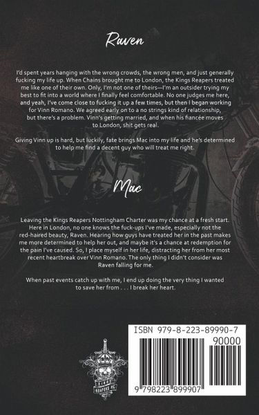 Raven I'd spent years hanging with the wrong crowds, the wrong men, and just generally fucking my life up. When Chains brought me to London, the Kings Reapers treated me like one of their own. Only, I'm not one of theirs-I'm an outsider trying my best to fit into a world where I finally feel comfortable. No one judges me here, and yeah, I've come close to fucking it up a few times, but then I began working for Vinn Romano. We agreed early on to a no strings kind of relationship, but there's a problem. Vinn's getting married, and when his fiancée moves to London, shit gets real. Giving Vinn up is hard, but luckily, fate brings Mac into my life and he's determined to help me find a decent guy who will treat me right. Mac Leaving the Kings Reapers, Nottingham Charter, was my chance at a fresh start. Here in London, no one knows the fuck-ups I've made, especially not the red-haired beauty, Raven. Hearing how guys have treated her in the past makes me more determined to help her out, and maybe it's a chance at redemption for the pain I've caused. So, I place myself in her life, distracting her from her most recent heartbreak over Vinn Romano. The only thing I didn't consider, was Raven falling for me. When past events catch up with me, I end up doing the very thing I wanted to save her from . . . I break her heart.