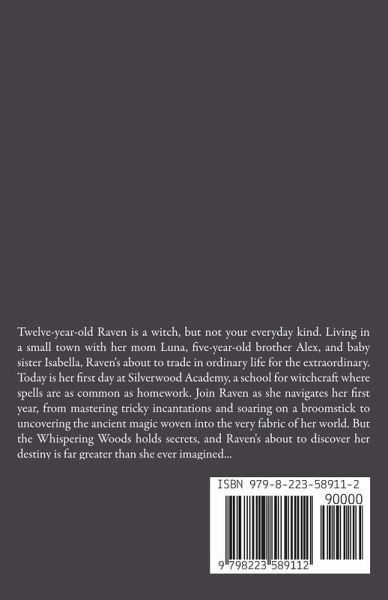 Twelve-year-old Raven is a witch, but not your everyday kind. Living in a small town with her mom Luna, five-year-old brother Alex, and baby sister Isabella, Raven's about to trade in ordinary life for the extraordinary. Today is her first day at Silverwood Academy, a school for witchcraft where spells are as common as homework. Join Raven as she navigates her first year, from mastering tricky incantations and soaring on a broomstick to uncovering the ancient magic woven into the very fabric of her world. But the Whispering Woods holds secrets, and Raven's about to discover her destiny is far greater than she ever imagined...