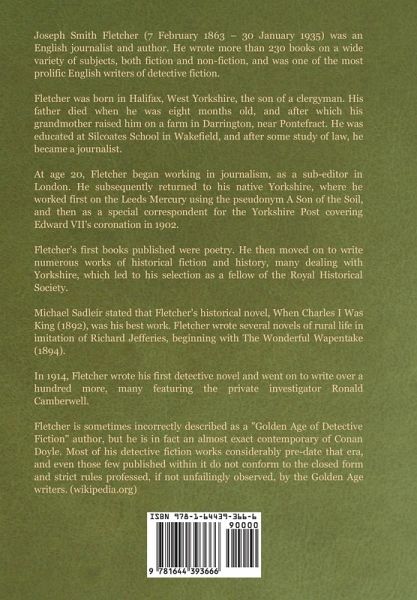 Joseph Smith Fletcher (7 February 1863 - 30 January 1935) was an English journalist and author. He wrote more than 230 books on a wide variety of subjects, both fiction and non-fiction, and was one of the most prolific English writers of detective fiction. Fletcher was born in Halifax, West Yorkshire, the son of a clergyman. His father died when he was eight months old, and after which his grandmother raised him on a farm in Darrington, near Pontefract. He was educated at Silcoates School in Wakefield, and after some study of law, he became a journalist. At age 20, Fletcher began working in journalism, as a sub-editor in London. He subsequently returned to his native Yorkshire, where he worked first on the Leeds Mercury using the pseudonym A Son of the Soil, and then as a special correspondent for the Yorkshire Post covering Edward VII's coronation in 1902. Fletcher's first books published were poetry. He then moved on to write numerous works of historical fiction and history, many dealing with Yorkshire, which led to his selection as a fellow of the Royal Historical Society. Michael Sadleir stated that Fletcher's historical novel, When Charles I Was King (1892), was his best work. Fletcher wrote several novels of rural life in imitation of Richard Jefferies, beginning with The Wonderful Wapentake (1894). In 1914, Fletcher wrote his first detective novel and went on to write over a hundred more, many featuring the private investigator Ronald Camberwell. Fletcher is sometimes incorrectly described as a "Golden Age of Detective Fiction" author, but he is in fact an almost exact contemporary of Conan Doyle. Most of his detective fiction works considerably pre-date that era, and even those few published within it do not conform to the closed form and strict rules professed, if not unfailingly observed, by the Golden Age writers. (wikipedia.org)