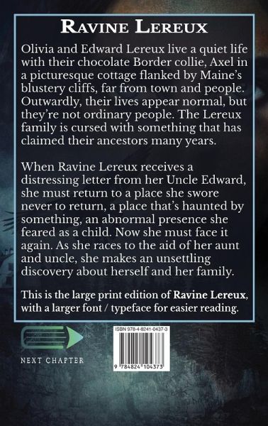 Olivia and Edward Lereux live a quiet life with their chocolate Border collie, Axel in a picturesque cottage flanked by Maine's blustery cliffs, far from town and people. Outwardly, their lives appear normal, but they're not ordinary people. The Lereux family is cursed with something that has claimed their ancestors many years. When Ravine Lereux receives a distressing letter from her Uncle Edward, she must return to a place she swore never to return, a place that's haunted by something, an abnormal presence she feared as a child. Now she must face it again. As she races to the aid of her aunt and uncle, she makes an unsettling discovery about herself and her family. This is the large print edition of Ravine Lereux, with a larger font / typeface for easier reading.