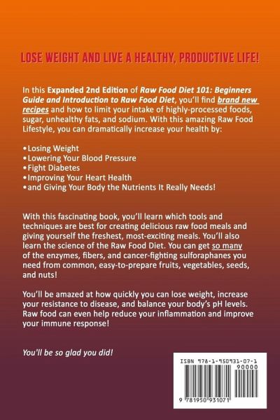 Lose Weight and Live a Healthy, Productive Life! In this Expanded 2nd Edition of Raw Food Diet 101: Beginners Guide and Introduction to Raw Food Diet, you'll find brand new recipes and how to limit your intake of highly-processed foods, sugar, unhealthy fats, and sodium. With this amazing Raw Food Lifestyle, you can dramatically increase your health by: Losing Weight Lowering Your Blood Pressure Fight Diabetes Improving Your Heart Health and Giving Your Body the Nutrients It Really Needs! With this fascinating book, you'll learn which tools and techniques are best for creating delicious raw food meals and giving yourself the freshest, most-exciting meals. You'll also learn the science of the Raw Food Diet. You can get so many of the enzymes, fibers, and cancer-fighting sulforaphanes you need from common, easy-to-prepare fruits, vegetables, seeds, and nuts! You'll be amazed at how quickly you can lose weight, increase your resistance to disease, and balance your body's pH levels. Raw food can even help reduce your inflammation and improve your immune response! You'll be so glad you did!