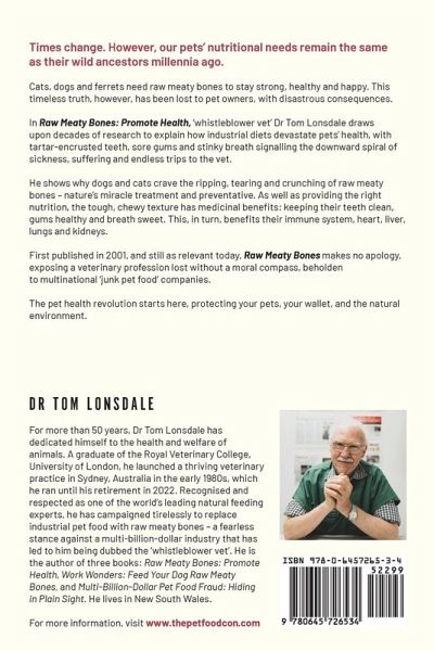 Times change. However, our pets' nutritional needs remain the same as their wild ancestors millennia ago. Cats, dogs and ferrets need raw meaty bones to stay strong, healthy and happy. This timeless truth, however, has been lost to pet owners, with disastrous consequences. In Raw Meaty Bones: Promote Health, 'whistleblower vet' Dr Tom Lonsdale draws upon decades of research to explain how industrial diets devastate pets' health, with tartar-encrusted teeth, sore gums and stinky breath signalling the downward spiral of sickness, suffering and endless trips to the vet. He shows why dogs and cats crave the ripping, tearing and crunching of raw meaty bones - nature's miracle treatment and preventative. As well as providing the right nutrition, the tough, chewy texture has medicinal benefits: keeping their teeth clean, gums healthy and breath sweet. This, in turn, benefits their immune system, heart, liver, lungs and kidneys. First published in 2001, and still as relevant today, Raw Meaty Bones makes no apology, exposing a veterinary profession lost without a moral compass, beholden to multinational 'junk pet food' companies. The pet health revolution starts here, protecting your pets, your wallet, and the natural environment.
