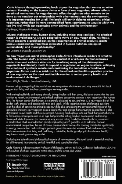 'In Raw Veganism, moral philosopher Carlo Alvaro introduces readers to what he calls "the human diet", practiced in the context of a virtuous life that embraces moderation and eschews violence. By countering many of the philosophical arguments traditionally made to support a vegetarian or vegan existence, critiquing the creation of synthetic meats, and considering the limitations of traditional veganism, Alvaro makes a solid case for the ethical and health supportive practice of raw veganism as the most sustainable counter to contemporary health and environmental challenges.' - Laura Wright, Western Carolina University, USA
