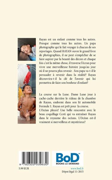 Rayan est un enfant comme tous les autres. Presque comme tous les autres. Un papa photographe qui le fait voyager à chacun de ses reportages. Quand RAYAN ouvre le grand livre de photographies, il ne peut s'empêcher de se faire aspirer par la beauté des décors et chaque fois c'est la même chose, il traverse l'écran pour vivre une merveilleuse histoire jusqu'au jour où il ne pourra plus revenir . Son papa va-t-il le persuader à revenir dans la réalité? Rayan découvrira-t-il la clé de l'avenir qui lui permettra de faire des allers-retours pour son bonheur d'enfant?Rayan et la lune - Rayan le grand bleu -Deux premiers voyages qui vont en appeler bien d'autres...Même les adultes à l'âme d'enfant voudraient être du voyage...