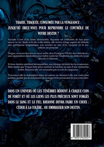 Trahie, traquée, consumée par la vengeance : jusqu'où iriez-vous pour reprendre le contrôle de votre destin ? Accusée à tort d'une crime abominable, Rayanne est contrainte de fuir pour sauver sa vie. Seule et livrée à elle-même, elle trouve refuge auprès de Glenda, une guérisseuse énigmatique, une sorcière au sein d'un royaume où la sorcellerie est proscrite. Torgan, un jeune homme au coeur noble, rêve d'intégrer l'Ordre des Libérateurs, une organisation clandestine pour lutter contre les Ténébreux, les sbires du tyran Shyrak d'Allanord. Si leur destins semblent incompatibles, une étrange alchimie les lie néanmoins. Mais tandis que Torgan lutte pour ramener la lumière au sein d'une monarchie brisée, Rayanne elle, est consumée par sa soif de vengeance. trouvera-t-elle la rédemption dans cet amour ou choisira-t-elle une route plus sombre, guidée par les murmures de la magie et les promesses de pouvoirs interdits ? Dans un univers où les Ténèbres rôdent à chaque coin de forêt et où les liens les plus précieux sont forgés dans le sang et le feu, Rayanne devra faire un choix : céder à la colère... ou embrasser son Destin. Ce roman est une suite indirecte de "Shyrak - Le Livre des Ombres" et de "Elerinna - Le Globe de Némosos", mais il peut se lire indépendamment.
