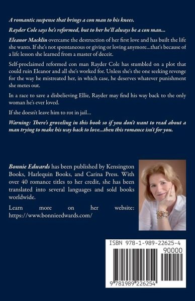A romantic suspense that brings a con man to his knees. Rayder Cole says he's reformed, but to her he'll always be a con man... Eleanor Macklin overcame the destruction of her first love and has built the life she wants. If she's not spontaneous or giving or loving anymore...that's because of a life lesson she learned from a master of deceit. Self-proclaimed reformed con man Rayder Cole has stumbled on a plot that could ruin Eleanor and all she's worked for. Unless she's the one seeking revenge for the way he mistreated her, in which case, he deserves whatever punishment she metes out. In a race to save a disbelieving Ellie, Rayder may find his way back to the only woman he's ever loved. If she doesn't leave him to rot in jail... Warning: There's groveling in this book so if you don't want to read about a man trying to make his way back to love...then this romance isn't for you.