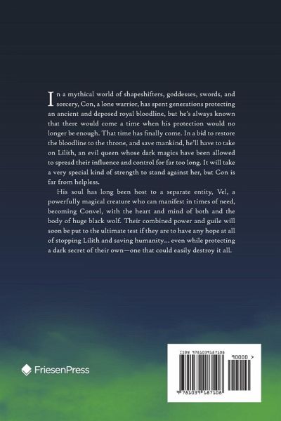 In a mythical world of shapeshifters, goddesses, swords, and sorcery, Con, a lone warrior, has spent generations protecting an ancient and deposed royal bloodline, but he's always known that there would come a time when his protection would no longer be enough. That time has finally come. In a bid to restore the bloodline to the throne, and save mankind, he'll have to take on Lilith, an evil queen whose dark magics have been allowed to spread their influence and control for far too long. It will take a very special kind of strength to stand against her, but Con is far from helpless. His soul has long been host to a separate entity, Vel, a powerfully magical creature who can manifest in times of need, becoming Convel, with the heart and mind of both and the body of huge black wolf. Their combined power and guile will soon be put to the ultimate test if they are to have any hope at all of stopping Lilith and saving humanity ... even while protecting a dark secret of their own-one that could easily destroy it all.