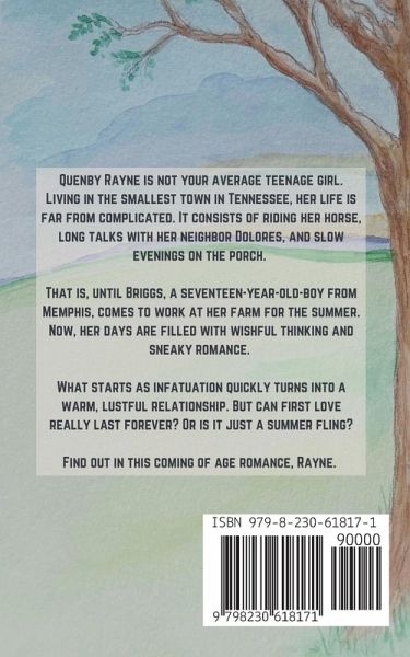 Quenby Rayne is not your average teenage girl. Living in the smallest town in Tennessee, her life is far from complicated. It consists of riding her horse, long talks with her neighbor Dolores, and slow evenings on the porch. That is, until Briggs, a seventeen-year-old-boy from Memphis, comes to work at her farm for the summer. Now, her days are filled with wishful thinking and sneaky romance. What starts as infatuation quickly turns into a warm, lustful relationship. But can first love really last forever? Or is it just a summer fling? Find out in this coming of age romance, Rayne.
