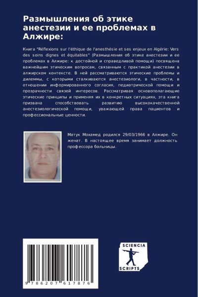 Kniga "Réflexions sur l'éthique de l'anesthésie et ses enjeux en Algérie: Vers des soins dignes et équitables" (Razmyshleniq ob ätike anestezii i ee problemah w Alzhire: k dostojnoj i sprawedliwoj pomoschi) poswqschena wazhnejshim äticheskim woprosam, swqzannym s praktikoj anestezii w alzhirskom kontexte. V nej rassmatriwaütsq äticheskie problemy i dilemmy, s kotorymi stalkiwaütsq anesteziologi, w chastnosti, w otnoshenii informirowannogo soglasiq, pediatricheskoj pomoschi i prozrachnosti swqzej interesow. Rassmatriwaq osnowopolagaüschie äticheskie principy i primenqq ih w konkretnyh situaciqh, äta kniga prizwana sposobstwowat' razwitiü wysokokachestwennoj anesteziologicheskoj pomoschi, uwazhaüschej prawa pacientow i professional'nye cennosti.