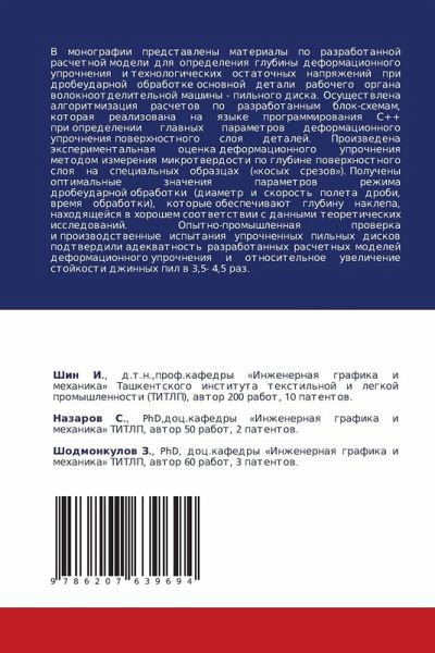 V monografii predstawleny materialy po razrabotannoj raschetnoj modeli dlq opredeleniq glubiny deformacionnogo uprochneniq i tehnologicheskih ostatochnyh naprqzhenij pri drobeudarnoj obrabotke osnownoj detali rabochego organa woloknootdelitel'noj mashiny - pil'nogo diska. Osuschestwlena algoritmizaciq raschetow po razrabotannym blok-shemam, kotoraq realizowana na qzyke programmirowaniq S++ pri opredelenii glawnyh parametrow deformacionnogo uprochneniq powerhnostnogo sloq detalej. Proizwedena äxperimental'naq ocenka deformacionnogo uprochneniq metodom izmereniq mikrotwerdosti po glubine powerhnostnogo sloq na special'nyh obrazcah ('kosyh srezow'). Polucheny optimal'nye znacheniq parametrow rezhima drobeudarnoj obrabotki (diametr i skorost' poleta drobi, wremq obrabotki), kotorye obespechiwaüt glubinu naklepa, nahodqschejsq w horoshem sootwetstwii s dannymi teoreticheskih issledowanij. Opytno-promyshlennaq prowerka i proizwodstwennye ispytaniq uprochnennyh pil'nyh diskow podtwerdili adekwatnost' razrabotannyh raschetnyh modelej deformacionnogo uprochneniq i otnositel'noe uwelichenie stojkosti dzhinnyh pil w 3,5- 4,5 raz.