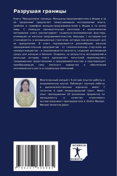 Kniga "Preodolewaq granicy: Zhenschiny-predprinimateli w Indii i za ee predelami" predlagaet zahwatywaüschee issledowanie opyta, problem i triumfow zhenschin-predprinimatelej w Indii i po wsemu miru. S pomosch'ü pronicatel'nyh rasskazow i analiticheskih materialow kniga rassmatriwaet social'no-äkonomicheskie faktory, wliqüschie na zhenskoe predprinimatel'stwo, bar'ery, s kotorymi oni stalkiwaütsq, i innowacionnye strategii, kotorye oni ispol'zuüt dlq ih preodoleniq. V knige podcherkiwaetsq raznoobrazie zhenskih predprinimatel'skih predpriqtij - ot tehnologicheskih startapow do nizowyh iniciatiw - i podcherkiwaetsq wazhnost' sozdaniq inklüziwnoj sredy dlq zhenschin w biznese. Opiraqs' na rezul'taty issledowanij i real'nye istorii, kniga wdohnowlqet chitatelej pereosmyslit' tradicionnye predstawleniq o predprinimatel'stwe i podtwerzhdaet preobrazuüschuü silu zhenskogo liderstwa w obespechenii äkonomicheskogo rosta i social'nyh izmenenij.