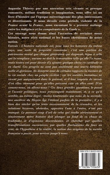 Augustin Thierry par une narration très vivante et presque romancée, mêlant érudition et imagination, nous offre ici un livre d'histoire sur l'époque mérovingienne des plus intéressants et divertissants. Il nous dévoile cette période violente de la France avant la France, nous racontant le premier mélange entre les indigènes et les conquérants de la Gaule . Cet ouvrage nous donne ainsi l'occasion de revisiter notre histoire, notre récit national et les bases chrétiennes de notre nation. Extraits : L'histoire nationale est, pour tous les hommes du même pays, une sorte de propriété commune ; c'est une portion du patrimoine moral que chaque génération qui disparaît, lègue à celle qui la remplace ; aucune ne doit la transmettre telle qu'elle l'a reçue, mais toutes ont pour devoir d'y ajouter quelque chose en certitude et en clarté. Ces progrès ne sont pas seulement une uvre littéraire noble et glorieuse, ils donnent sous de certains rapports la mesure de la vie sociale chez un peuple civilisé ; car les sociétés humaines ne vivent pas uniquement dans le présent, et il leur importe de savoir d'où elles viennent pour qu'elles puissent voir où elles vont. D'où venons-nous, où allons-nous ? Ces deux grandes questions, le passé et l'avenir politiques, nous préoccupent maintenant, et, à ce qu'il semble, au même degré ; moins tourmentés que nous de la seconde, nos ancêtres du Moyen Âge l'étaient parfois de la première ; il y a bien des siècles qu'on tente incessamment de la résoudre, et les solutions bizarres, absurdes, opposées l'une à l'autre, n'ont pas manqué. Le premier coup d'il de celui qui étudie sérieusement et sincèrement notre histoire doit plonger au fond de ce chaos de traditions et d'opinions discordantes, et chercher par quelles transformations successives, par quelles fluctuations du faux au vrai, de l'hypothèse à la réalité, la notion des origines de la société française a passé, pour arriver jusqu'à nous......La manière de vivre des rois francs, l'intérieur de la maison royale, la vie orageuse des seigneurs et des évêques ; l'usurpation, les guerres civiles et les guerres privées ; la turbulence intrigante des Gallo-Romains et l'indiscipline brutale des Barbares ; l'absence de tout ordre administratif et de tout lien moral entre les habitants des provinces gauloises, au sein d'un même royaume ; le réveil des antiques rivalités et des haines héréditaires de canton à canton et de ville à ville ; partout une sorte de retour à l'état de nature, et l'insurrection des volontés individuelles contre la règle et la loi, sous quelque forme qu'elles se présentent, politique, civile ou religieuse ; l'esprit de révolte et de violence régnant jusque dans les monastères de femmes : tels sont les tableaux divers que j'ai essayé de tracer d'après les monuments contemporains, et dont la réunion doit offrir une vue du VIe siècle en Gaule.