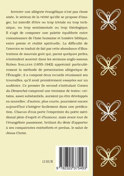 Inventer une allégorie évangélique n'est pas chose aisée, le sérieux de la vérité qu'elle se propose d'imager, lui interdit d'être ou trop triviale ou trop technique, ou trop sentimentale ou trop théologique. Il s'agit de composer une palette équilibrée entre connaissance de l'âme humaine et lumière biblique, entre poésie et réalité spirituelle. La difficulté de l'exercice se traduit de fait par cette abondance d'illustrations de mauvais goût qui, parmi quelques perles, s'entendent souvent dans les sermons anglo-saxons. Ruben Saillens (1855-1942) appréciait particulièrement la méthode de présentation allégorique de l'Évangile ; il a composé deux recueils réunissant ses trouvailles, qu'il avait premièrement essayées sur un auditoire. Ce premier (le second s'intitulant Contes du Dimanche) comprend une trentaine de textes ; certains, assez substantiels, auraient pu être développés en nouvelles ; d'autres, plus courts, pourraient encore aujourd'hui s'intégrer facilement dans une prédication. Chacun d'eux porte l'empreinte du poète méridional plein d'esprit et d'humour, mais avant tout de l'évangéliste passionné, brûlant du désir d'apporter à ses compatriotes enténébrés et perdus, le salut de Jésus-Christ. Cette édition ThéoTeX reproduit celle de 1896.