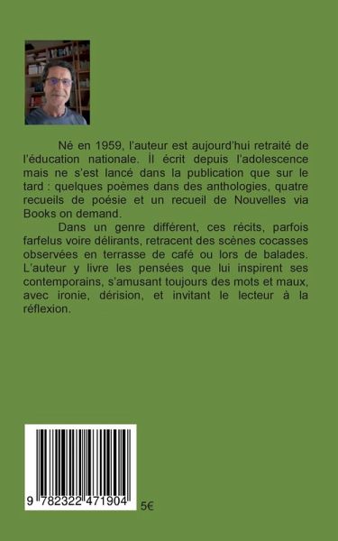 Scènes de terrasse de café où les pensées du narrateur se nourrissent de l'observation pour en garder les moments cocasses. Puis ses pensées se poursuivent au bord de l'eau, en ville, chez sa couturière, pendant le confinement. Pensées tantôt farfelues, tantôt délirantes, souvent tendres, s'amusant toujours des mots. Calembours, invitant souvent à la réflexion. Non sens, ironie, dérision. Rire pour ne pas pleurer...