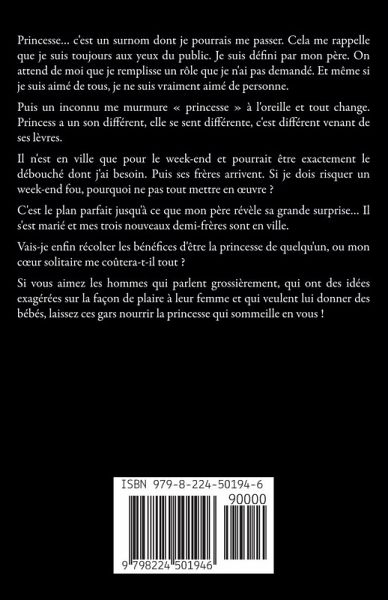 Princesse... c'est un surnom dont je pourrais me passer. Cela me rappelle que je suis toujours aux yeux du public. Je suis défini par mon père. On attend de moi que je remplisse un rôle que je n'ai pas demandé. Et même si je suis aimé de tous, je ne suis vraiment aimé de personne. Puis un inconnu me murmure princesse à l'oreille et tout change. Princess a un son différent, elle se sent différente, c'est différent venant de ses lèvres. Il n'est en ville que pour le week-end et pourrait être exactement le débouché dont j'ai besoin. Puis ses frères arrivent. Si je dois risquer un week-end fou, pourquoi ne pas tout mettre en ¿uvre ? C'est le plan parfait jusqu'à ce que mon père révèle sa grande surprise... Il s'est marié et mes trois nouveaux demi-frères sont en ville. Vais-je enfin récolter les bénéfices d'être la princesse de quelqu'un, ou mon c¿ur solitaire me coûtera-t-il tout ? Si vous aimez les hommes qui parlent grossièrement, qui ont des idées exagérées sur la façon de plaire à leur femme et qui veulent lui donner des bébés, laissez ces gars nourrir la princesse qui sommeille en vous !