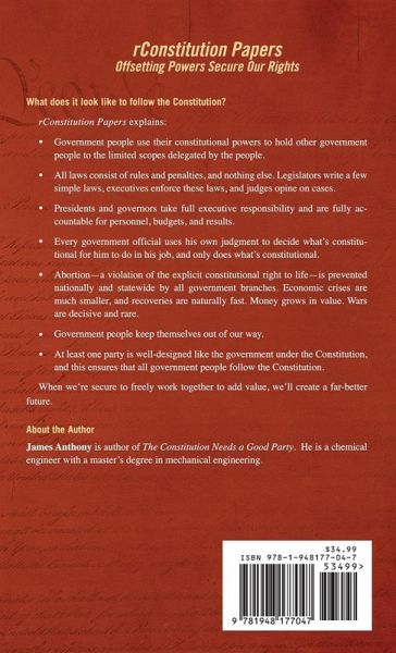 What does it look like to follow the Constitution? rConstitution Papers explains: ¿ Government people hold other government people to specific constitutionally limited scopes delegated by the people. ¿ All laws consist of rules and penalties, and nothing else. ¿ Presidents and governors take full executive responsibility and are fully accountable for personnel, budgets, and results. ¿ Every government official independently determines what's constitutional, and only does what's constitutional. ¿ Wars are rare and decisive. Abortion-a violation of the explicit constitutional right to life-is prevented nationally and statewide by all government branches. Money grows in value, and economic crises are short and minor. ¿ Government people keep themselves out of our way. ¿ At least one party is well-designed like the Constitution, which makes sure that its people follow the Constitution. When we're secure to freely work together to add value, we'll create a far-better future.