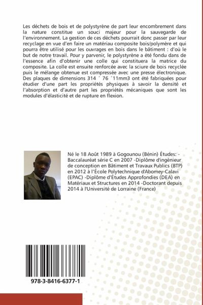 Les déchets de bois et de polystyrène de part leur encombrement dans la nature constitue un souci majeur pour la sauvegarde de l'environnement. La gestion de ces déchets pourrait donc passer par leur recyclage en vue d'en faire un matériau composite bois/polymère et qui pourra être utilisé pour les ouvrages en bois dans le bâtiment : d'où le but de notre travail. Pour y parvenir, le polystyrène a été fondu dans de l'essence afin d'obtenir une colle qui constituera la matrice du composite. La colle est ensuite renforcée avec la sciure de bois recyclée puis le mélange obtenue est compressée avec une presse électronique. Des plaques de dimensions 314 76 11mm3 ont été fabriquées pour étudier d'une part les propriétés physiques à savoir la densité et l'absorption et d'autre part les propriétés mécaniques que sont les modules d'élasticité et de rupture en flexion.