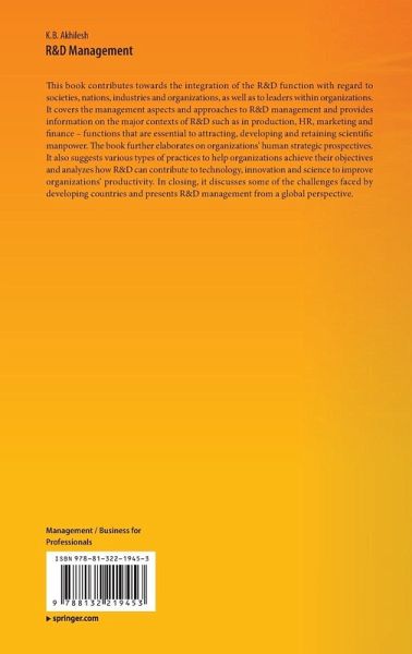 Chapter 1: Introduction to R&D Function.- Chapter 2: R&D: Reactive and Passive Partner to Responsive Collaborator.- Chapter 3: Driving the Economy through R&D Activities.- Chapter 4: The Strategic Aspects of R&D Management.- Chapter 5: Project Planning and Budgeting.- Chapter 6: Road mapping.- Chapter 7: Project Selection.- Chapter 8: Project Evaluation.- Chapter 9: Human Resource Management in R&D.- Chapter 10: Attraction and Retention of Talent in R&D.- Chapter 11: Creativity in R&D Organizations.- Chapter 12: Interpersonal Relationships, Teams and Team building.- Chapter 13: Innovation Management.- Chapter 14: Portfolio Management.- Chapter 15: New Product Development.- Annexure 1: History and Growth of R&D in India.- Annexure 2: Indian Science &Technology System.
