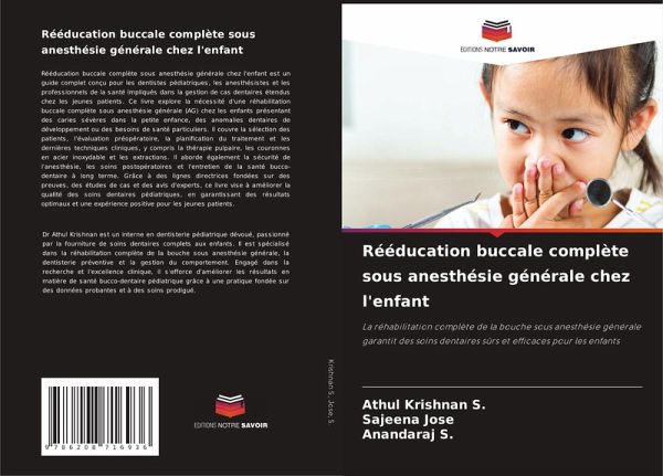 Rééducation buccale complète sous anesthésie générale chez l'enfant est un guide complet conçu pour les dentistes pédiatriques, les anesthésistes et les professionnels de la santé impliqués dans la gestion de cas dentaires étendus chez les jeunes patients. Ce livre explore la nécessité d'une réhabilitation buccale complète sous anesthésie générale (AG) chez les enfants présentant des caries sévères dans la petite enfance, des anomalies dentaires de développement ou des besoins de santé particuliers. Il couvre la sélection des patients, l'évaluation préopératoire, la planification du traitement et les dernières techniques cliniques, y compris la thérapie pulpaire, les couronnes en acier inoxydable et les extractions. Il aborde également la sécurité de l'anesthésie, les soins postopératoires et l'entretien de la santé bucco-dentaire à long terme. Grâce à des lignes directrices fondées sur des preuves, des études de cas et des avis d'experts, ce livre vise à améliorer la qualité des soins dentaires pédiatriques, en garantissant des résultats optimaux et une expérience positive pour les jeunes patients.
