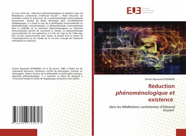 Ce livre traite de « réduction phénoménologique et existence dans les Méditations cartésiennes d'Edmund Husserl ». René Descartes est considéré comme le précurseur de la phénoménologie transcendantale husserlienne. Partant du doute développé dans ses Méditations métaphysiques, il a frayé la voie de la philosophie transcendantale ou phénoménologie transcendantale. La phénoménologie transcendantale dont la méthode est la reduction phénoménologique ou réduction transcendantale permet de construire le monde. La phénoménologie transcendantale est une expérience à la fois de l'ego et de l'alter-ego. Elle est une communication avec l'autre, le monde d'où la notion de l'intersubjectivité ou du monde de la vie. Elle s'occupe de l'existence individuelle et collective.
