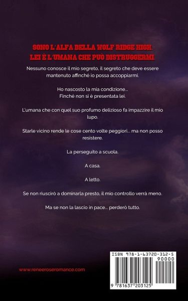 SONO L'ALFA DELLA WOLF RIDGE HIGH. LEI È L'UMANA CHE PUÒ DISTRUGGERMI. Nessuno conosce il mio segreto, il segreto che deve essere mantenuto affinché io possa accoppiarmi. Ho nascosto la mia condizione... Finché non si è presentata lei. L'umana che con quel suo profumo delizioso fa impazzire il mio lupo. Starle vicino rende le cose cento volte peggiori... ma non posso resistere. La perseguito a scuola. A casa. A letto. Se non riuscirò a dominarla presto, il mio controllo verrà meno. Ma se non la lascio in pace... perderò tutto. Renee Rose, autrice di bestseller di USA Today, presenta questa nuovo e intenso romanzo mutaforma bully per adulti.