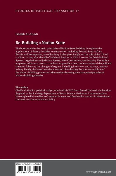 The book provides the main principles of Nation-State Building. It explores the applications of these principles to many states, including Poland, South-Africa, Bosnia and Herzegovina, as well as Iraq. It also gives insight on the role of the US-led coalition in Iraq after the fall of Saddam's Regime in 2003. It covers the fields Political System, Legislation and Judiciary System, New Constitution, and Security. The author employed additional research methods to provide a deep understanding of the political situation following the changes of regime, including interviews and surveys, namely in Iraq. Finally, the book provides a method of evaluating the success or failure of the Nation-Building process of other nations by using the main principal rules of Nation-Building theories.