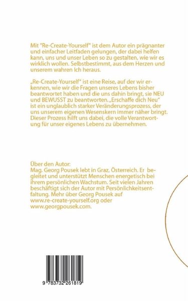 Mit Re-Create-Yourself Erschaffe dich Neu ist dem Autor ein prägnanter und einfacher Leitfaden gelungen, der dabei helfen kann, uns und unser Leben so zu gestalten, wie wir es wirklich wollen. Selbstbestimmt, aus dem Herzen und unserem wahren Ich heraus.Re-Create-Yourself ist eine Reise, auf der wir erkennen, wie wir die Fragen unseres Lebens bisher beantwortet haben und die uns dahin bringt, sie neu und bewusst zu beantworten. Erschaffe dich Neu ist ein unglaublich starker Veränderungsprozess, der uns unserem eigenen Wesenskern immer näher bringt. Dieser Prozess hilft uns dabei, die volle Verantwortung für unser eigenes Lebens zu übernehmen.