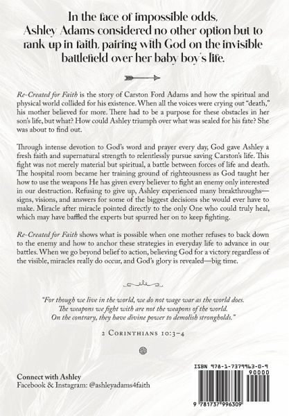 Ashley Adams is an inspirational writer who actively journals God's voice and the direction He has for her every day. Re-Created for Faith is the birthplace of her ministry. She blindly trusts in God for the next big steps to expand the Kingdom, faithfully using her social media platforms to encourage people through real-life heartache and God's plan for it. Ashley lives to see souls saved, serving as a board member and director at Scioto Youth Camp: Reaching Kids for Christ, along with hosting Bible studies in her home for women of the community. Ashely and her husband, Justin, now have four children, including their newest baby boy. They recently made a big move out of town and into the country. They now reside on what used to be her great-grandfather's farm of over one hundred acres and are building a new home, excited for what the future holds. Ashley is determined to obey the Lord as He guides, raising tiny disciples through her homeschooling and pressing in on aspirations to adopt more children. Ashley's faith has been tried by fire, yet she experiences God's blessings ten-fold. To read original posts from Carston's battle, search #prayersforcartson on Facebook. For current updates and encouragement through life, follow Ashley on Facebook and Instagram @ashleyadams4faith.