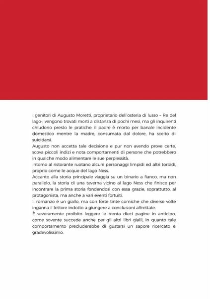 I genitori di Augusto Moretti, proprietario dell'osteria di lusso - Re del lago-, vengono trovati morti a distanza di pochi mesi, ma gli inquirenti chiudono presto le pratiche: il padre è morto per banale incidente domestico mentre la madre, consumata dal dolore, ha scelto di suicidarsi. Augusto non accetta tale decisione e pur non avendo prove certe, scova piccoli indizi e nota comportamenti di persone che potrebbero in qualche modo alimentare le sue perplessità. Intorno al ristorante ruotano alcuni personaggi limpidi ed altri torbidi, proprio come le acque del lago Ness. Accanto alla storia principale viaggia su un binario a fianco, ma non parallelo, la storia di una taverna vicino al lago Ness che finisce per incontrare la prima storia fondendosi con essa grazie, soprattutto, al protagonista, ma anche a vari eventi fortuiti. Il romanzo è un giallo, ma con forte tinte comiche che diverse volte inganna il lettore indotto a giungere a conclusioni affrettate. È severamente proibito leggere le trenta dieci pagine in anticipo, come sovente succede anche per gli altri libri gialli, in quanto tale comportamento precluderebbe di gustarsi un sapore ricercato e gradevolissimo.