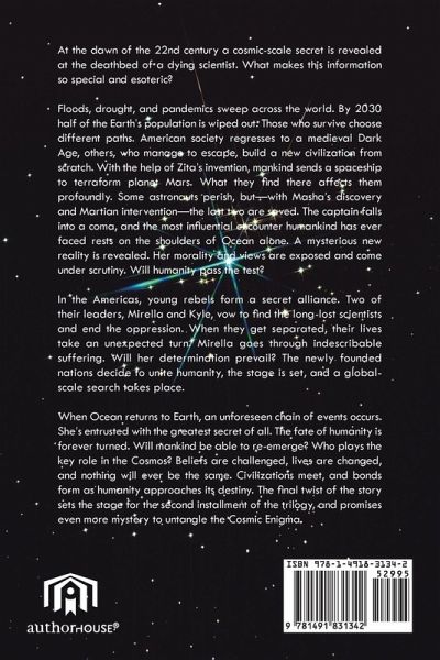 At the dawn of the 22nd century a cosmic-scale secret is revealed at the deathbed of a dying scientist. What makes this information so special and esoteric? Floods, drought, and pandemics sweep across the world. By 2030 half of Earth's population is wiped out. Those who survive choose different paths. American society regresses to a medieval Dark Age, others, who manage to escape, build a new civilization from scratch. With the help of Zita's invention, mankind sends a spaceship to terraform planet Mars. What they find there affects them profoundly. Some astronauts perish, but --with Masha's discovery and Martian intervention --the last two are saved. The captain falls into a coma, and the most influential encounter humankind has ever faced rests on the shoulders of Ocean alone. A mysterious new reality is revealed. Her perspectives and views are exposed and come under scrutiny. Will humanity pass the test? In the Americas, young rebels form a secret alliance. Two of their leaders, Mirella and Kyle, vow to find the long-lost scientists and end the oppression. When they get separated, their lives take an unexpected turn. Mirella goes through indescribable suffering. Will her determination prevail? The newly founded nations decide to unite humanity, the stage is set, and a global-scale search takes place. When Ocean returns to Earth, an unforeseen chain of events occurs. She's entrusted with the greatest secret of all. The fate of humanity is forever turned. Will mankind be able to re-emerge? Who plays the key role in the Cosmos? Beliefs are challenged, lives are changed, and nothing will ever be the same. Civilizations meet, and bonds form as humanity approaches its destiny. The final twist of the story sets the stage for the second installment of the trilogy, and promises even more mystery to untangle the Cosmic Enigma.