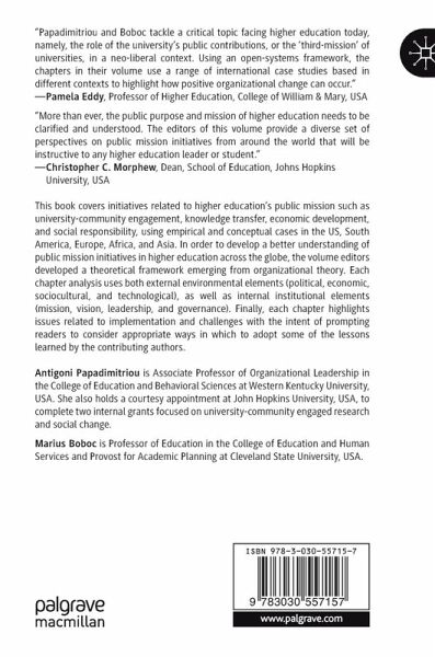 Introduction. Patterns of the public mission in colleges and universities.- Chapter 1. Recharging higher education's social responsibility via anchor institutions as knowledge hubs of opportunity.- Chapter 2. Public-Private Partnerships: Community Engagement through Economic Redevelopment.- Chapter 3. From Northwood Plaza to Northwood Commons: Morgan State University's Role in Community, Economic, and Business Development.- Chapter 4. University engagement and methodological concerns and challenges for developing Community Based Participation Collaborative Research.- Chapter 5. Cultivating a culture of faculty belonging: Exploring identity, congruence, and job choice theory at research universities.- Chapter 6. Vision Network: A community college's process to plan and engage community.- Chapter 7. Higher Education and the Commitment to its Public Mission: The Case of Extension Projects in a Brazilian University.- Chapter 8. Conceptualization of the university's third mission in Panama.- Chapter 9. A Multi-dimensional transparency tool for Community Engagement: TEFCE pilot at the University of Twente, the Netherlands.- Chapter 10. Community engagement in Italian higher education: University of Verona case study.- Chapter 11. Is Being Socially Responsible Always Responsible? Contextualizing University Social Responsibility: An Ethiopian Perspective.- Chapter 12. The Entrepreneurial State and the Public Mission of Higher Education Reinvented: Examining Knowledge Transfer Policies of Hong Kong's Universities and Impact of the Academic Profession.- Chapter 13. Conclusions and Recommendations for Future Research in University's Public Mission.