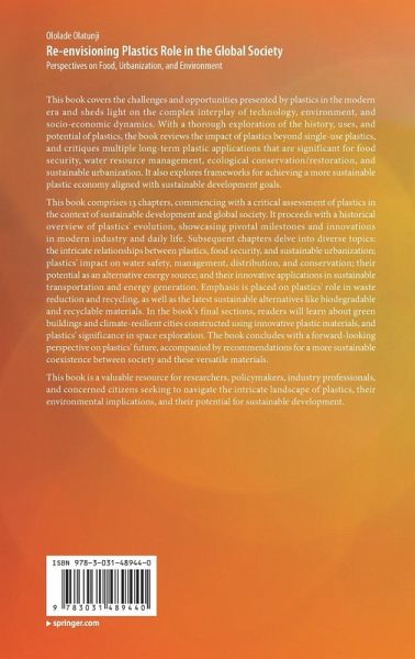 This book comprises 13 chapters, commencing with a critical assessment of plastics in the context of sustainable development and global society. It proceeds with a historical overview of plastics' evolution, showcasing pivotal milestones and innovations in modern industry and daily life. Subsequent chapters delve into diverse topics: the intricate relationships between plastics, food security, and sustainable urbanization; plastics' impact on water safety, management, distribution, and conservation; their potential as an alternative energy source; and their innovative applications in sustainable transportation and energy generation. Emphasis is placed on plastics' role in waste reduction and recycling, as well as the latest sustainable alternatives like biodegradable and recyclable materials. In the book's final sections, readers will learn about green buildings and climate-resilient cities constructed using innovative plastic materials, and plastics' significance in space exploration. The book concludes with a forward-looking perspective on plastics' future, accompanied by recommendations for a more sustainable coexistence between society and these versatile materials.
