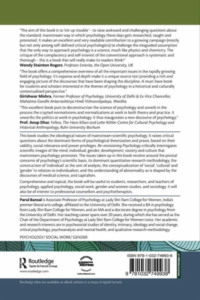 This book studies the ideological nature of mainstream scientific psychology. It raises critical questions about the dominant forms of psychological theorization and praxis, based on their validity, social relevance and power privileges. Re-envisioning Psychology critically interrogates scientific images of the mind, individual, gender, development, society and culture that mainstream psychology promotes. The issues taken up in this book revolve around the pivotal concerns of psychology's scientific basis, its dominant quantitative research methodology, the construction of 'individual' as the unit of analysis, the conceptualization of 'social', 'cultural' and 'gender' in relation to individualism, and the understanding of abnormality as shaped by the discourses of medical science and capitalism.