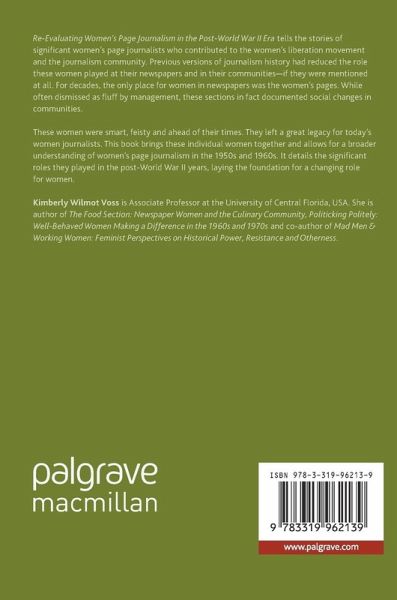 Re-Evaluating Women's Page Journalism in the Post-World War II Era tells the stories of significant women's page journalists who contributed to the women's liberation movement and the journalism community. Previous versions of journalism history had reduced the role these women played at their newspapers and in their communities-if they were mentioned at all. For decades, the only place for women in newspapers was the women's pages. While often dismissed as fluff by management, these sections in fact documented social changes in communities.