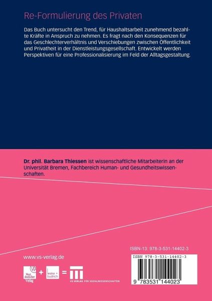 Das Buch untersucht den Trend, für Haushaltsarbeit zunehmend bezahlte Kräfte in Anspruch zu nehmen. Es fragt nach den Konsequenzen für das Geschlechterverhältnis und Verschiebungen zwischen Öffentlichkeit und Privatheit in der Dienstleistungsgesellschaft. Entwickelt werden Perspektiven für eine Professionalisierung im Feld der Alltagsgestaltung.