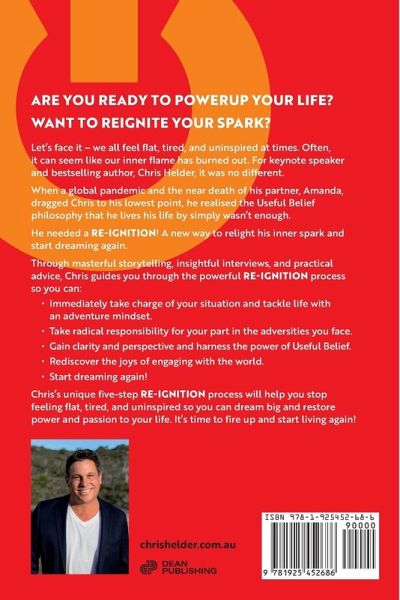 RE-IGNITION ARE YOU READY TO POWERUP YOUR LIFE? WANT TO REIGNITE YOUR SPARK? Let's face it - we all feel flat, tired, and uninspired at times. Often, it can seem like our inner flame has burned out. For keynote speaker and bestselling author, Chris Helder, it was no different. When a global pandemic and the near death of his partner, Amanda, dragged Chris to his lowest point, he realised the Useful Belief philosophy that he lives his life by simply wasn't enough. He needed a RE-IGNITION! A new way to relight his inner spark and start dreaming again. Through masterful storytelling, insightful interviews, and practical advice, Chris guides you through the powerful RE-IGNITION process so you can: Immediately take charge of your situation and tackle life with an adventure mindset. Take radical responsibility for your part in the adversities you face. Gain clarity and perspective and harness the power of Useful Belief. Rediscover the joys of engaging with the world. Start dreaming again! Chris's unique five-step RE-IGNITION process will help you stop feeling flat, tired, and uninspired so you can dream big and restore power and passion to your life. It's time to fire up and start living again! chrishelder.com.au