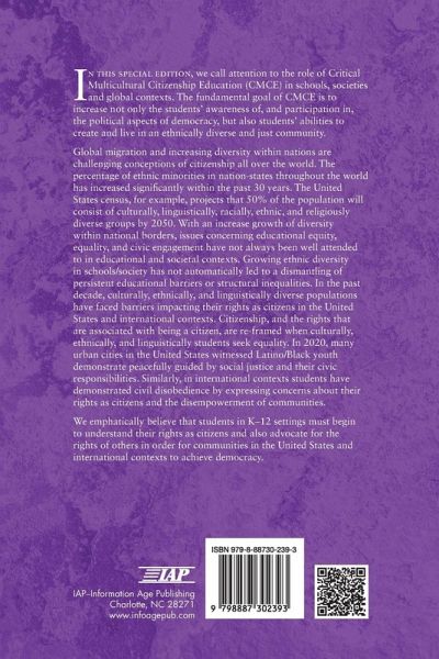 In this special edition, we call attention to the role of Critical Multicultural Citizenship Education (CMCE) in schools, societies and global contexts. The fundamental goal of CMCE is to increase not only the students' awareness of, and participation in, the political aspects of democracy, but also students' abilities to create and live in an ethnically diverse and just community. Global migration and increasing diversity within nations are challenging conceptions of citizenship all over the world. The percentage of ethnic minorities in nation- states throughout the world has increased significantly within the past 30 years. The United States Census, for example, projects that 50% of the population will consist of culturally, linguistically, racially, ethnic, and religiously diverse groups by 2050. With an increase growth of diversity within national borders, issues concerning educational equity, equality, and civic engagement have not always been well attended to in educational and societal contexts. Growing ethnic diversity in schools/ society has not automatically led to a dismantling of persistent educational barriers or structural inequalities. In the past decade, culturally, ethnically, and linguistically diverse populations have faced barriers impacting their rights as citizens in the United States and international contexts. Citizenship, and the rights that are associated with being a citizen, are re-framed when culturally, ethnically, and linguistically students seek equality. In 2020, many urban cities in the United States witnessed Latino/Black youth demonstrate peacefully guided by social justice and their civic responsibilities. Similarly, in international contexts students have demonstrated civil disobedience by expressing concerns about their rights as citizens and the disempowerment of communities. We emphatically believe that students in K-12 settings must begin to understand their rights as citizens and also advocate for the rights of others in order for communities in the U.S. and international contexts to achieve democracy.