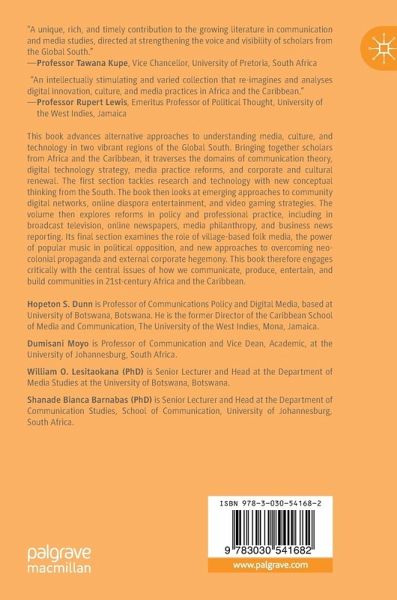 Hopeton S. Dunn is Professor of Communications Policy and Digital Media, based at University of Botswana, Botswana. He is the former Director of the Caribbean School of Media and Communication, The University of the West Indies, Mona, Jamaica. Dumisani Moyo is Professor of Communication and Vice Dean, Academic, at the University of Johannesburg, South Africa. William O. Lesitaokana (PhD) is Senior Lecturer and Head at the Department of Media Studies at the University of Botswana, Botswana. Shanade Bianca Barnabas (PhD) is Senior Lecturer and Head at the Department of Communication Studies, School of Communication, University of Johannesburg, South Africa.