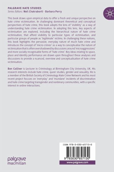 This book draws upon empirical data to offer a fresh and unique perspective on hate crime victimisation, using transphobic hate crime as a case study. It adopts the lens of 'visibility' as a way of understanding hate crime victimisation and to challenge dominant theoretical and conceptual perspectives of hate crime. In adopting this lens, key aspects of victimisation are explored, including the hierarchical nature of hate crime victimisation that afford visibility to particular types of victimisation and to particular groups of people to make them 'legitimate' victims. In challenging these notions, this book highlights the pervasive, everyday nature of much hate crime and introduces the concept of 'micro-crimes' as a way to conceptualise the nature of victimisation that is often overshadowed by discussions around 'microaggressions' and more socially recognisable forms of 'hate crime'. Key ideas relating to space, place and identity performance are drawn upon throughout these analyses and discussions to provide a nuanced overview and conceptualisation of hate crime victimisation.